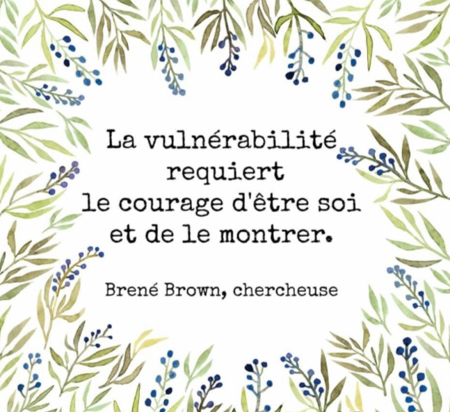 On pense souvent que vulnérabilité égale faiblesse mais je peux vous assurer qu’il n’en est rien. La vulnérabilité TOUT COMME LE COURAGE survient quand nous sommes dans le doute, en situation de risque ou exposés émotionnellement. Elle survient habituellement avec la honte, le manque, le chagrin et la peur. Pourquoi nous montrer vulnérables aux autres? Car la vulnérabilité c’est aussi le berceau de l’amour, la joie, l’appartenance à soi et aux autres, de la confiance, de l’inclusion, de l’équité, de l’empathie, etc…