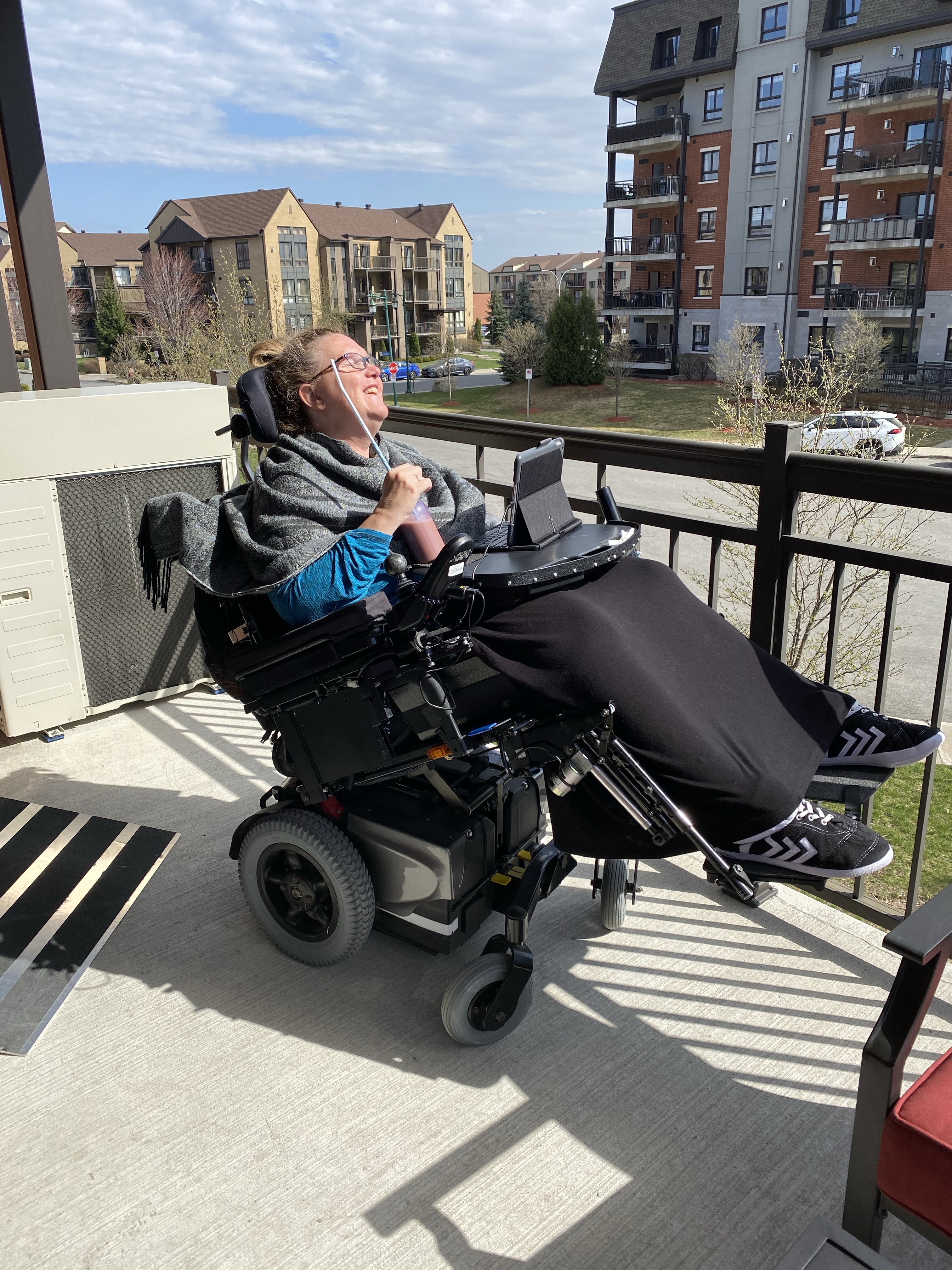 Il m’est toutefois arrivé un petit incident le mois dernier. Vous savez que mon Ipad constitut mon unique moyen de communication. Malheureusement, la technologie ne permet pas encore d’intégrer un téléphone au Ipad. Je dois utiliser Messenger, FaceTime ou Skype si je veux rejoindre quelqu’un pour demander de l’aide. Lorsque Jocelyn s’absente, il le fait, généralement, pour de brèves périodes. Il arrive toutefois que j’ai à me débrouiller pour quelques heures. C’est d’ailleurs ce qui s’est passé le mois dernier. Jocelyn venait à peine de quitter que j’ai eu un spasme de mes bras qui ont fait chavirer mon Ipad sur mes jambes. Après un instant de surprise, j’ai tenté de le récupérer. Je le voyais, si près de moi, mais impossible de l’atteindre. J’ai tout essayé : me basculer vers l’arrière, l’attraper par le fil d’alimentation, activer la bascule de mes jambes, rien ne fonctionnait. Un fort sentiment d’impuissance et d’incompréhension m’habitait. Je me sentais vulnérable. Je savais que Jocelyn en avait pour trois heures avant son retour. Malheureusement, la télévision était fermée. Je n’avais que ma colère, ma tristesse et ma frustration pour passer le temps.