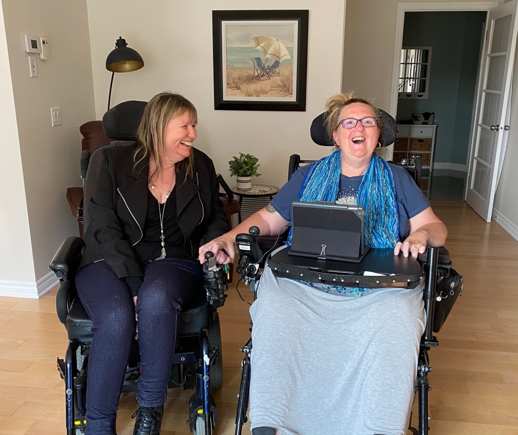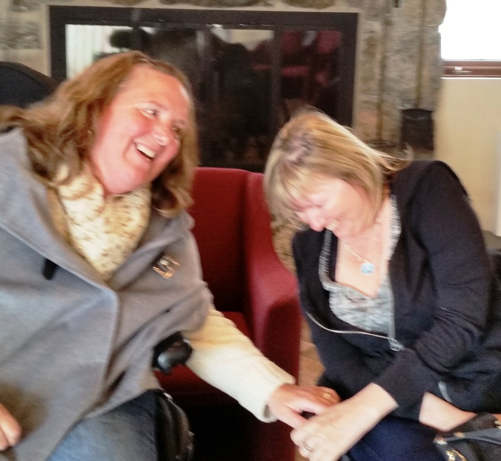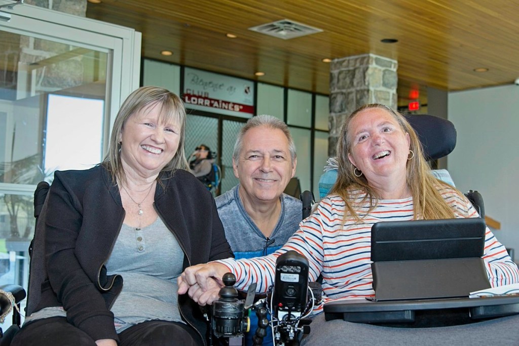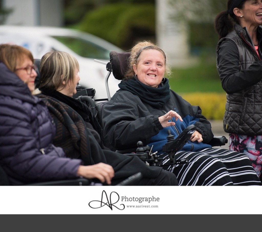 Ginette et moi rions beaucoup ensemble. La SLA amène ce qu’on appelle la labilité émotive. Pour faire simple, « lorsqu’on rit, on finit pu de rire, et lorsqu’on pleure, on arrête pu! ». Avec Ginette, un seul regard peut déclencher des fous rires interminables. Si bien, que lors de réunions, les intervenants évitent de nous asseoir côte à côte ou l’une en face de l’autre. Je me rappelle une session d’initiation à la méditation qui s’est transformée en séance de thérapie par le rire tellement Ginette et moi étions indisciplinées….lol.